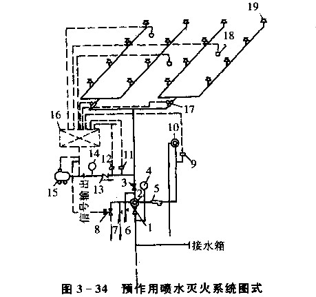 1-总控制阀;2-预作用阀;3-检修闸阀;4-压力表;5-过滤器;6-截止阀;7-手动开启截止闸;8-电磁阀;9-压力开关;10-水力警铃;11-压力天关(启闭空压机)12-低气压报警压力开关;13-止回阀;14-压力表;15-空压机;16-火灾报警控制箱;17-水流指示器;18-火灾探测器;19-闭式喷头预作用喷水灭火系统工作原理:发生火灾时,火灾探测器报警后,自动控制系统控制闸门排气、充水,由干式变为湿式系统。只有当着火点温度达到开启闭式喷头时,才开始喷水灭火。